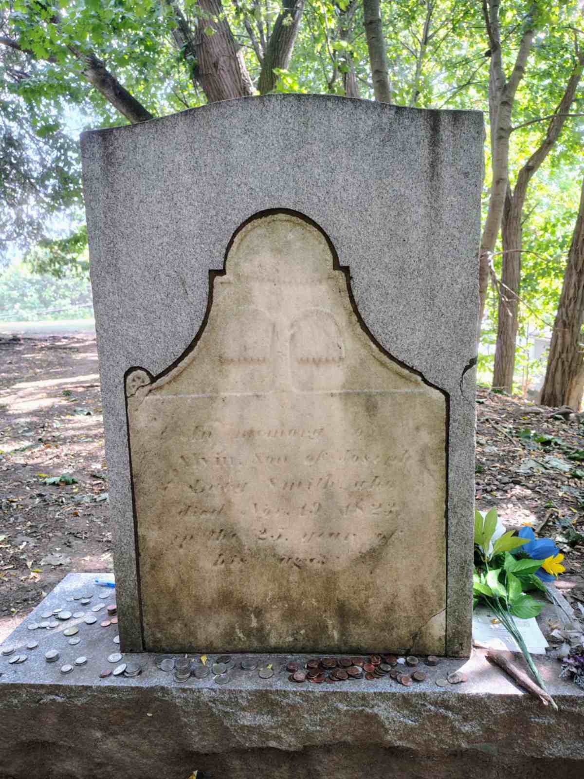 Yet amid this quiet fading, certain graves stand out, preserved with care and intention. The one that drew me here belongs to Alvin Smith, the eldest brother of the Prophet Joseph Smith. Alvin’s memorial commands a kind of reverence as soon as you see it. While many stones here have succumbed to the weight of years, his has been given new life through preservation. The original headstone, weathered and delicate, is encased within a solid granite marker that both honors and protects it. On the front, the inscription is sharp and legible, ensuring that his name and story will not be lost to erosion. On the back, the original carving can still be faintly seen, its letters softened and darkened by nearly two hundred years of history.