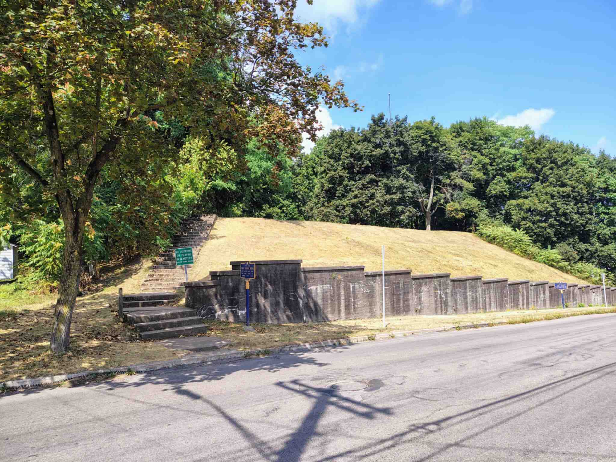 By the time we reached the top, I could feel the air shift. It seemed cooler and calmer, as though the tall trees surrounding the grounds were deliberately shielding this little hilltop from the rush of the world below. The landscape gently opens to a partial view over Palmyra, reminding you that while the town has grown and changed, this hill has remained a steady witness to every season and every passing year. The path into the cemetery is unassuming, with no grand gates or polished walkways, just the simple grass and weathered stones that have marked lives and stories for generations.