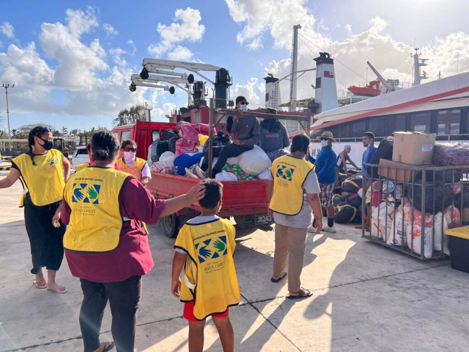Volunteers from stakes across Tongatapu helped load boats and trucks bound for outer islands, bringing food, water, clothing, and medical supplies. Though the work was exhausting, local leaders described it as an outpouring of love and faith.