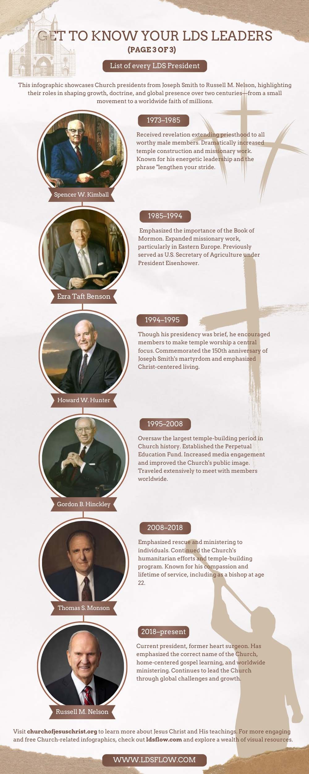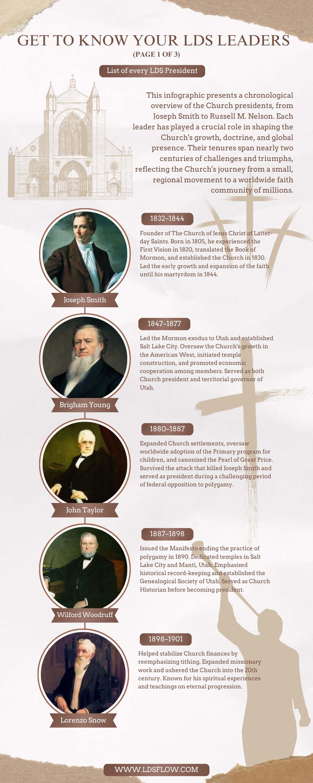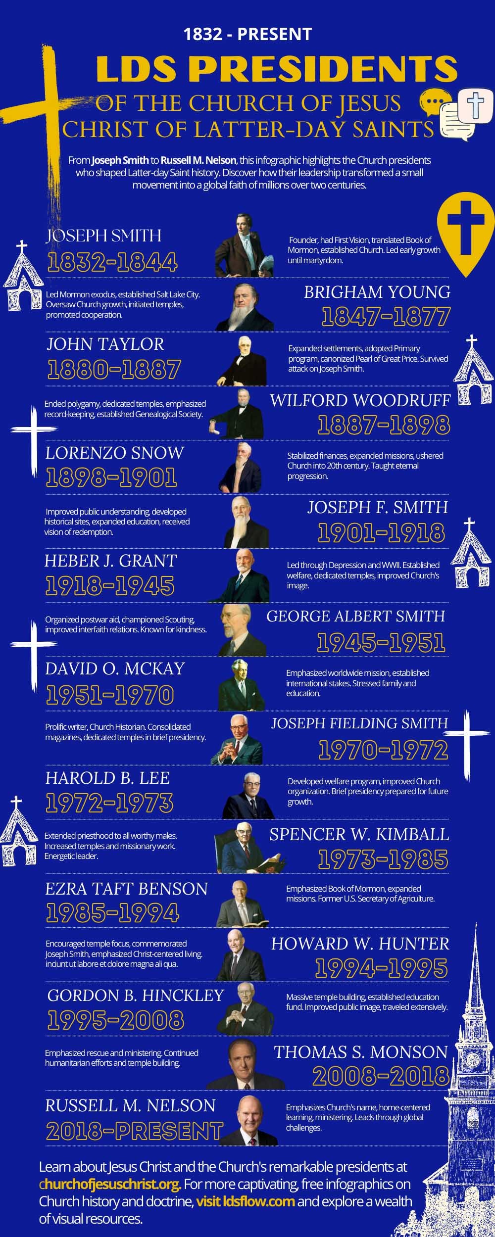 Before exploring the detailed list below, we invite you to view the information in infographic format. We’ve created two versions for your convenience: a concise overview and an expanded, more detailed representation. These visual aids offer a quick yet comprehensive look at the succession of Church presidents, their tenures, and key achievements. Take a moment to review these infographics for a broader perspective on the Church’s leadership history before diving into the full textual information.