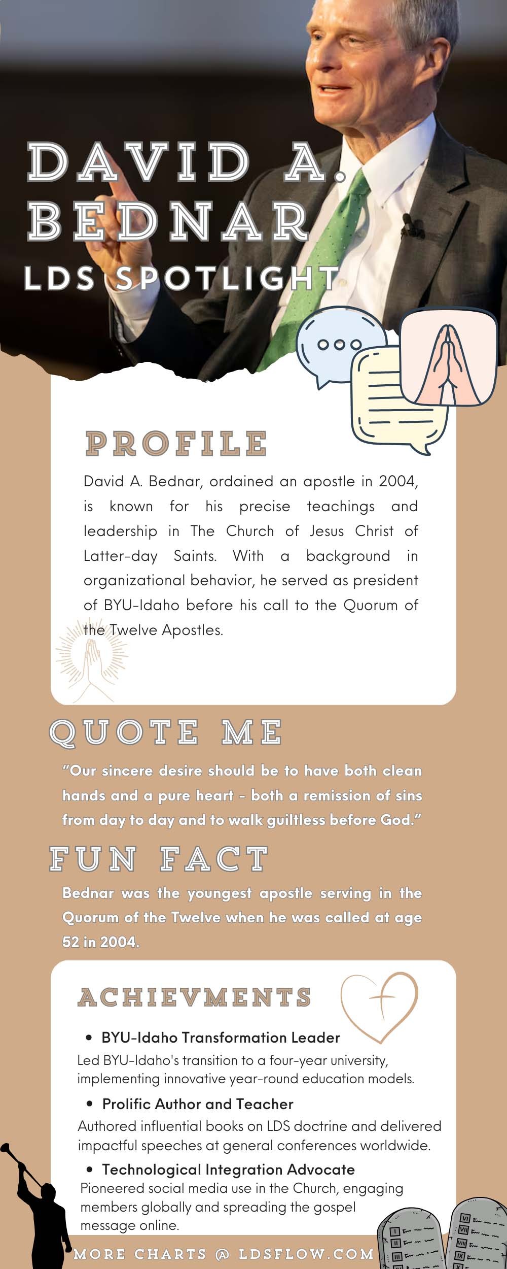 As a member of the Quorum of the Twelve, Bednar is recognized by the church as a prophet, seer, and revelator. He is currently the sixth most senior apostle in the church.