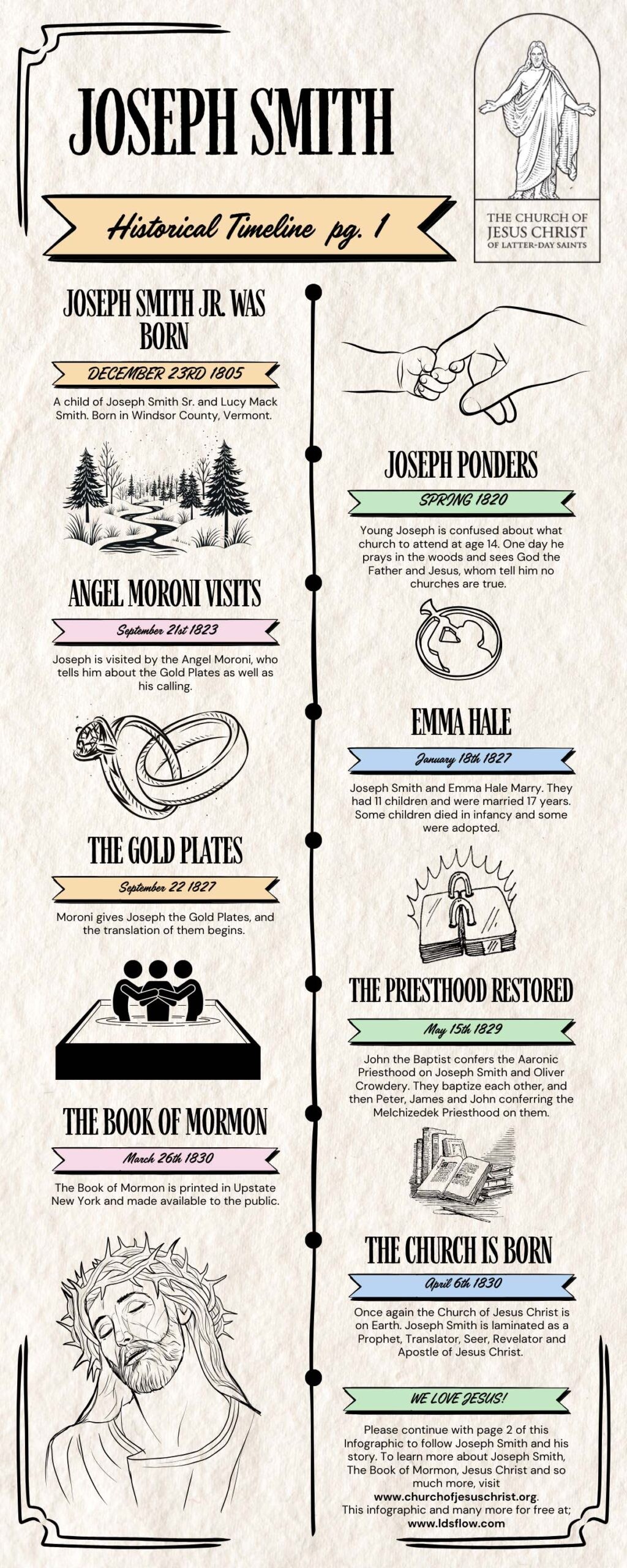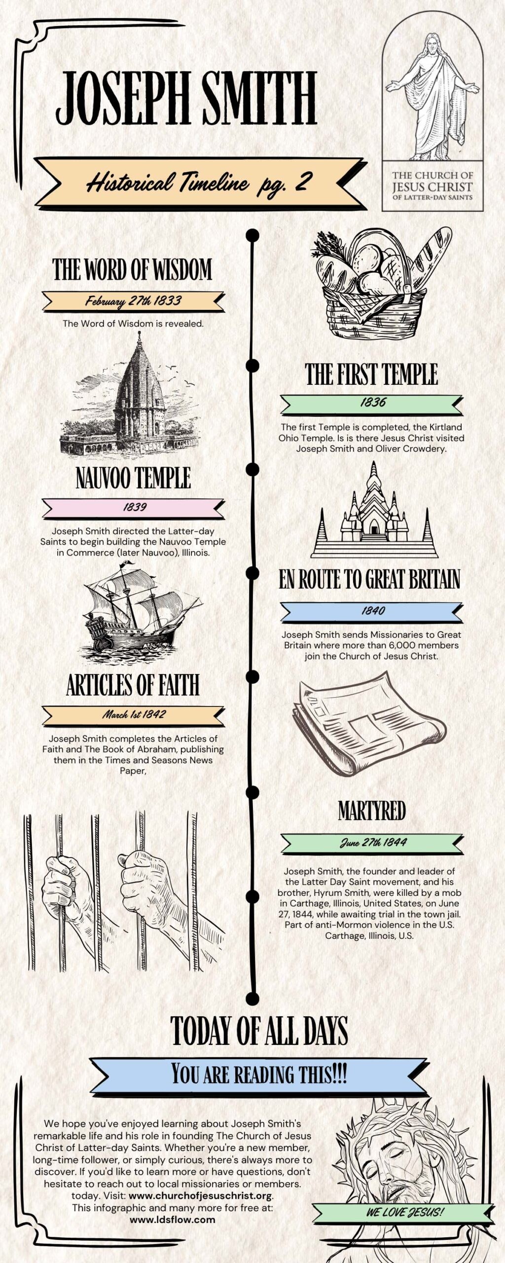 Before getting to the content, here is a short two page infographic which provides a visual overview of select key events in Joseph Smith’s life from 1835 to 1844, highlighting major milestones in the early history of the Church of Jesus Christ of Latter-day Saints. For a more detailed exploration of these events, including their context and significance, refer to the expanded timeline and explanations below.